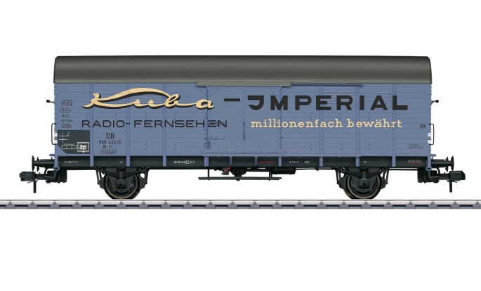 Der gedeckte Güterwagen des Typs Gl 11 der Deutschen Bundesbahn der Epoche III trägt eine außergewöhnliche Farbgebung mit Werbung für den Ton-Möbelhersteller "Kuba-Imperial", welcher in den 1960er Jahren hochwertige Möbel zum Beispiel mit eingebauten Radios produzierte.