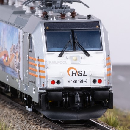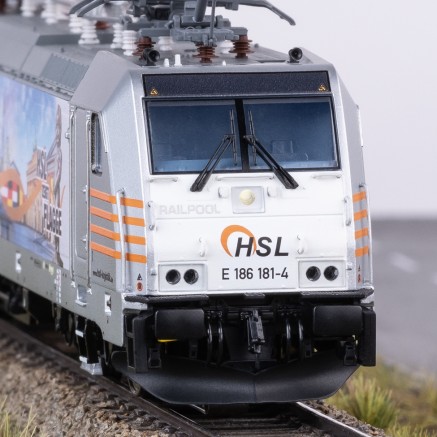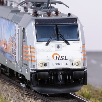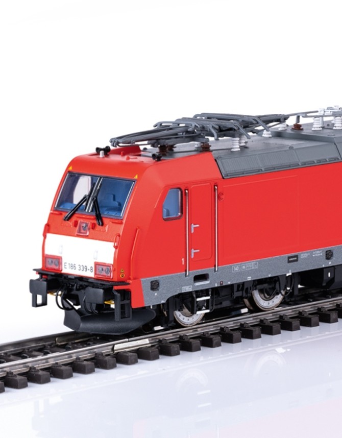 Nachdem die 186er bisher im Märklin Programm nur als einfacheres Start-Up vorhanden war, kommt nun ein zeitgemäßes und hochdetailliertes Modell ins Programm. Sowohl die Ausstattung unter der Lok, als auch auf dem Dach der Lok entspricht exakt dem jeweiligen Vorbild. Die jeweils unterschiedlichen Pantografen (Länderversionen) wurden entwickelt und sind äußerst fein ausgeführt. Die Seitenwände sind den Vorbild entsprechend teilweise profiliert und weisen alle Öffnungen und Armaturen dieser Generation der 186er auf. Drehgestelle und Radscheiben sind filigran detailliert. Viele separat angesetzte Teile wie Griffstangen, Sandkästen, Scheibenwischer, UIC-Steckdosen und alle Dachleitungen geben dem Modell einen hochwertigen Charakter. Die funktionale Ausstattung lässt ebenfalls keine Wünsche offen. Neben den originalen Geräuschfunktionen besitzen die unterschiedlichen Modelle dem Vorbild angepasste Lichtfunktionen. So sind z.B. die jeweiligen Lichtbilder der Einsatzländer nachstellbar. Der Führerstand und das Fahrpult können separat beleuchtet werden. Um kurze Stromlose Stellen auf der Anlage zu kompensieren besitzt das Modell einen einstellbaren Pufferkondensator. So kann das Modell per CV-Mapping exakt auf die elektronischen Gegebenheiten auf der Anlage konfiguriert werden. Die ersten Modelle sind 186 339-8 der DB AG, die 186 181-4 der HSL und die 186 310-9 der Euro Cargo Rail (EWS).