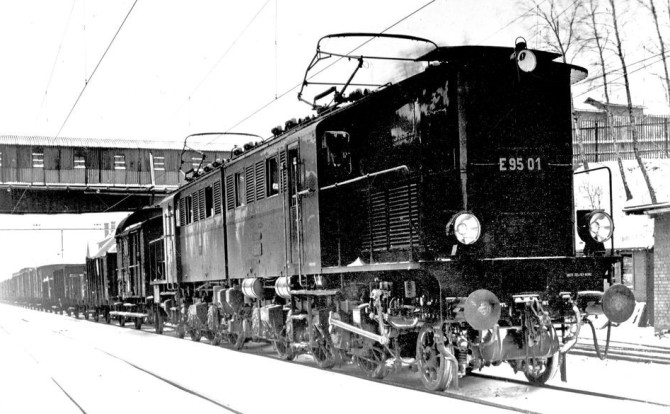 Die E 95 01 im Jahr 1928 vor einem gemischten Güterzug im Bahnhof Dittersbach. Copyright: RVM/Slg. Eisenbahnstiftung.
