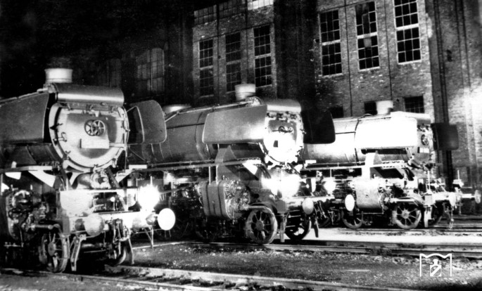 Gleich drei 01.10 stehen 1949 im Henschel-Werk in Kassel, wo sie "entstromt" und für ihre weiteren Einsätze vorbereitet wurden. (copyright: Slg.Helmut Bürger/Slg.Eisenbahnstiftung)